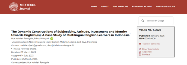 Artikel berjudul The Dynamic Constructions of Subjectivity, Attitude, Investment and Identity towards English(es): A Case Study of Multilingual English Learners in Indonesia tersebut ditulis bersama dosen pembimbingnya, Ribut Wahyudi, M.Ed., Ph.D., dan resmi dipublikasikan pada 25 Maret 2026 dalam MEXTESOL Journal Vol. 50 No. 1. Dengan peringkat SJR 0.243, Q2, serta H-Index 9, publikasi ini menegaskan posisi karya tersebut dalam lanskap akademik internasional yang kompetitif.