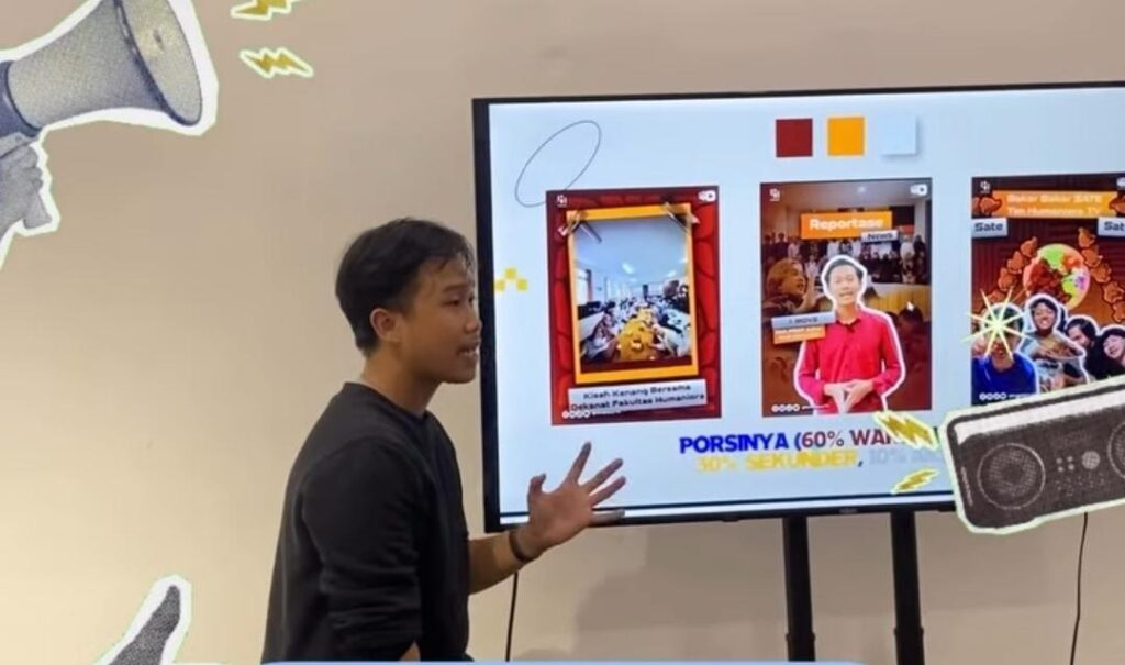 Dalam sesi pelatihan, Muzaky tidak hanya memperkenalkan dasar-dasar videografi seperti camera movements, angle shot, composition and framing, serta teknik editing, tetapi juga menekankan aspek konseptual dalam membangun konten yang kuat sejak tahap ide. Ia mengajak peserta memahami bahwa konten visual yang baik selalu berangkat dari gagasan yang matang dan dieksekusi dengan prinsip desain yang tepat.