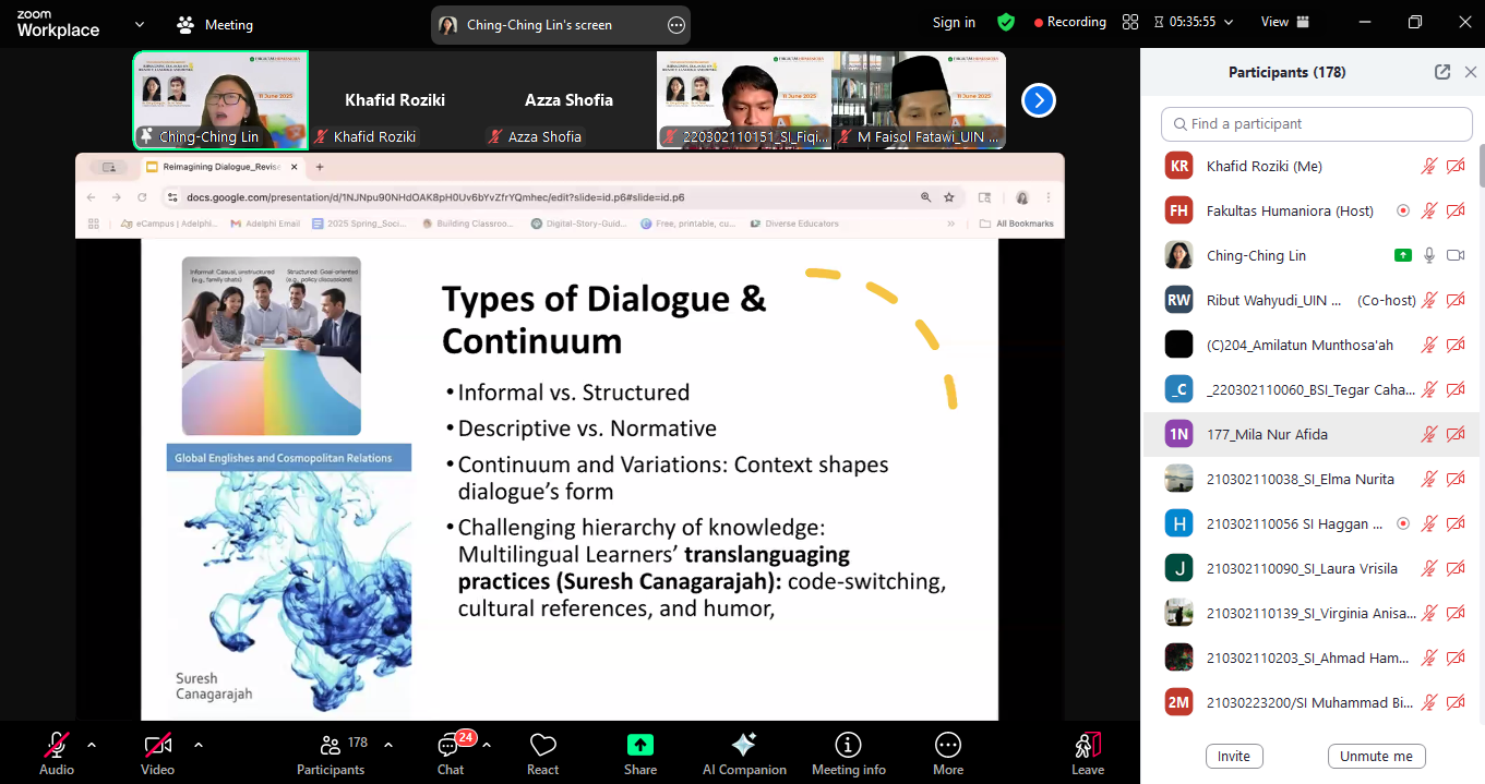 HUMANIORA – (11/6/2025) Dialog memegang peran sentral dalam membentuk dan mengonstruksi kembali pemahaman tentang identitas, bahasa, dan kekuasaan, terutama dalam ranah pendidikan dan penelitian. Hal itu disampaikan Dr. Ching-Ching Lin dari Adelphi University, New York, Amerika Serikat dalam International Scholar’s Engagement (ISE), Rabu, 11 Juni 2025. Dalam kesempatan tersebut, Dr. Lin menekankan bahwa dialog bukan sekadar sarana komunikasi, melainkan sebagai proses sosial yang dinamis yang memungkinkan lahirnya kesadaran kritis terhadap keberagaman latar belakang, pengalaman, serta posisi sosial individu dalam ruang akademik.