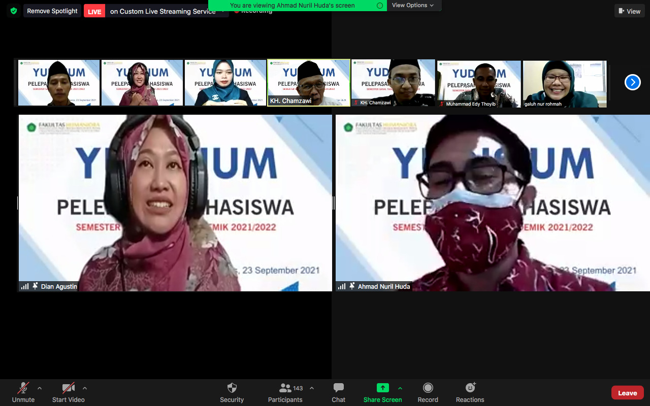 HUMANIORA (23/09/2021) – Fakultas Humaniora UIN Maulana Malik Ibrahim malang gelar Yudisium dan Pelepasan Mahasiswa Semester Gasal Tahun Akademik 2021/2022 secara daring pada Kamis, 23 September 2021 melalui aplikasi Zoom meeting dan Youtube live streaming. Dalam kegiatan Yudisium ini Sebanyak 149 mahasiswa Fakultas Humaniora secara sah dinyatakan lulus dan berhak memperoleh gelar kesarjanaan Strata-1 bidang ilmu bahasa dan Sastra.