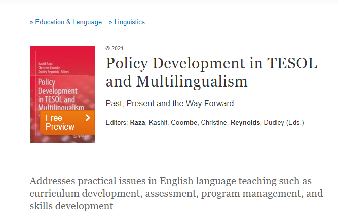 Oleh: Kashif Raza Diterjemahkan oleh: Ribut Wahyudi Buku yang berjudul “Perkembangan kebijakan dalam TESOL: Masa lampau, saat ini dan masa depan” (https://www.springer.com/gp/book/9789811636028) ini ditulis oleh berbagai pakar yang dieditori oleh Kashif Raza, Christine Coombe and Dudley Reynolds. Buku ini bertujuan untuk menjadi sebuah platform (sebagai wadah) untuk diskusi- diskusi