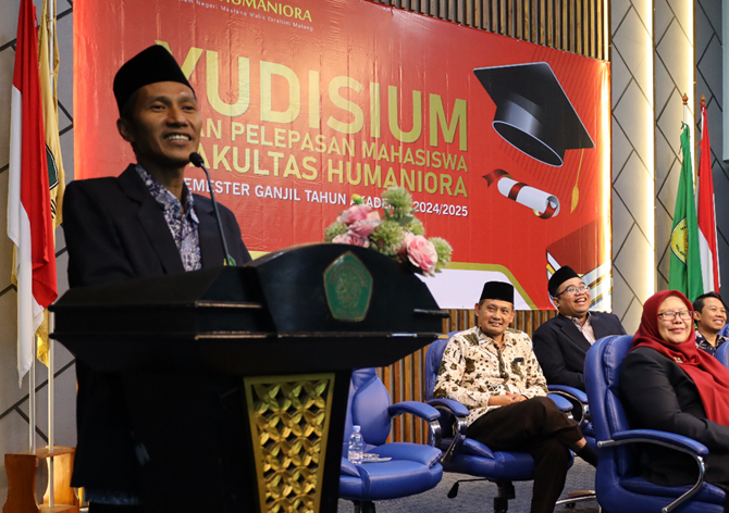 HUMANIORA – (25/7/2024) Dalam menghadapi tantangan zaman yang semakin kompleks dan dinamis, kemampuan manajemen risiko dan optimisme menjadi dua hal yang sangat penting bagi mahasiswa. Hal ini disampaikan oleh Dekan Fakultas Humaniora UIN Maulana Malik Ibrahim Malang, Dr. M. Faisol, dalam acara Yudisium dan Pelepasan Mahasiswa Semester Genap 2024/2025, Kamis,
