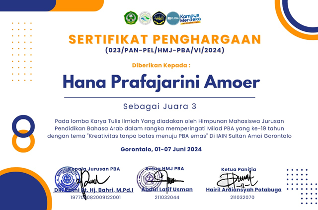 HUMANIORA – (12/6/2024) Hana Prafajarini Amoer, mahasiswa semester 4 Program Studi Bahasa dan Sastra Arab dari UIN Maulana Malik Ibrahim Malang, berhasil meraih prestasi gemilang di ajang “Semarak Milad PBA 2024” yang diselenggarakan oleh HMJ PBA IAIN Sultan Amai Gorontalo. Acara ini digelar dari tanggal 1 hingga 7 Juni di