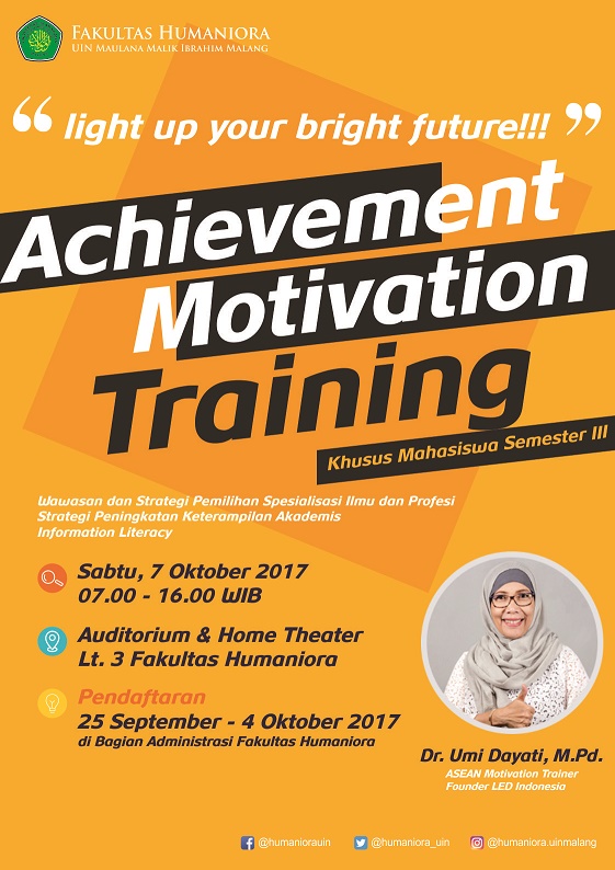 Event Details: Date: 7 Oktober 2017 – 7 Oktober 2017 07:00 – 16:00 Venue:Auditorium & Home Theater Lt. 3 Fakultas Humaniora Time left to event Achievement Motivation Training 2017 Waktu Sabtu, 7 Oktober 2017 pukul 07.00 – 16.00 WIB Tempat Auditorium & Home Theater lt. 3 Fakultas Humaniora Narasumber Dr.