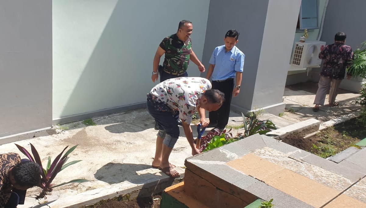 Selepas melakukan penghijauan di area taman bagian depan, kegiatan dilanjutkan dengan membersihkan area belakang serta samping gedung yang ditumbuhi tanaman-tanaman liar dan merapikan tanaman yang terlalu rindang.