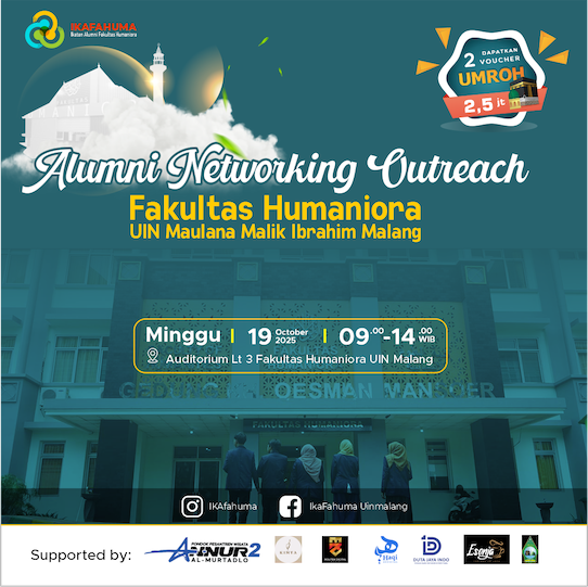 HUMANIORA – (8/10/2025) Fakultas Humaniora Universitas Islam Negeri (UIN) Maulana Malik Ibrahim Malang akan menggelar kegiatan Alumni Networking Outreach pada Minggu, 19 Oktober 2025. Kegiatan ini merupakan hasil kolaborasi antara Fakultas Humaniora dan Ikatan Alumni Fakultas Humaniora (Ikafahuma), yang bertujuan memperkuat jejaring dan sinergi antara kampus dengan para alumni. Acara akan berlangsung di Auditorium Lantai 3 Fakultas Humaniora, dan diharapkan menjadi ajang penting bagi para alumni lintas angkatan untuk saling terhubung dan berkontribusi bagi kemajuan almamater.