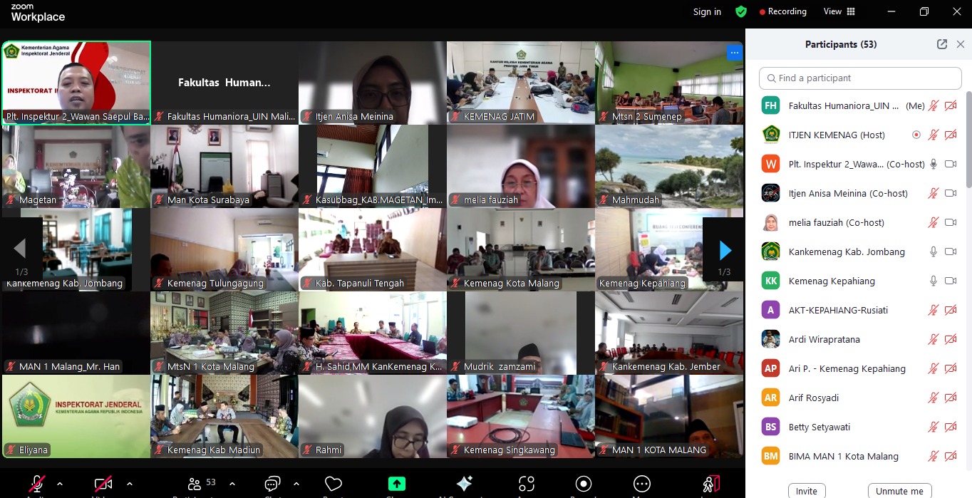 HUMANIORA – (17/4/2025) Fakultas Humaniora UIN Maulana Malik Ibrahim Malang kembali menunjukkan komitmen kuatnya dalam membangun budaya birokrasi yang akuntabel dan bebas dari praktik korupsi. Komitmen tersebut diwujudkan melalui partisipasi aktif dalam kegiatan Entry Meeting Evaluasi Akuntabilitas Kinerja Instansi Pemerintah (AKIP) untuk satuan kerja binaan Inspektorat Jenderal II Kementerian Agama Republik Indonesia, yang dilaksanakan pada Rabu, 16 April 2025, secara daring melalui platform Zoom Meeting.