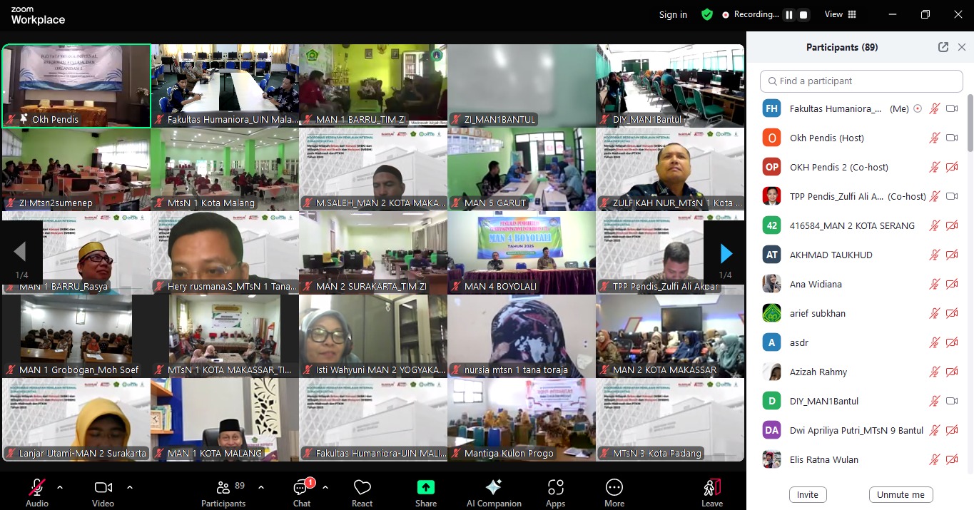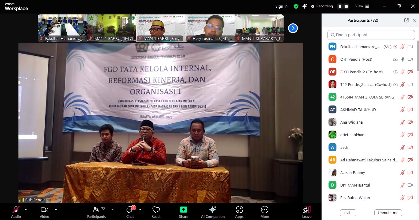 HUMANIORA – (6/3/2025) Fakultas Humaniora UIN Maulana Malik Ibrahim Malang berpartisipasi dalam kegiatan Focus Group Discussion (FGD) bertajuk Tata Kelola Internal Reformasi Kinerja dan Organisasi serta Koordinasi Pelaksanaan Penilaian Internal Pembangunan Zona Integritas pada madrasah dan PTKIN tahun 2025. Acara ini diselenggarakan secara daring oleh Direktorat Jenderal Pendidikan Islam Kementerian Agama Republik Indonesia pada Kamis, 6 Maret 2025.