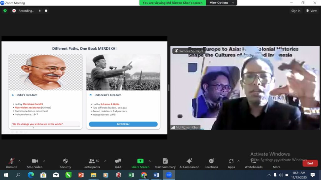 Dalam diskusi yang dipandu Finda Mufihatun Najihah, Md Rizwan Khan menjelaskan bahwa kolonialisme bukan hanya tentang eksploitasi ekonomi, tetapi juga tentang perubahan sosial dan budaya yang meninggalkan jejak mendalam hingga masa kini.