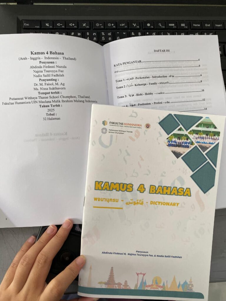 Karya inovatif ini disusun oleh Abdinda Firdausi Nuzula, Najma Tsuroyya Faz, dan Nadia Sailil Fadhilah, dengan penyuntingan oleh Dr. M. Faisol, M.Ag. (Indonesia) dan Ms. Nissa Sukthavorn (Thailand). Kamus setebal 32 halaman tersebut resmi diterbitkan di Pattanasat Witthaya Thasae School, Chumphon, Thailand, bekerja sama dengan Fakultas Humaniora UIN Malang.