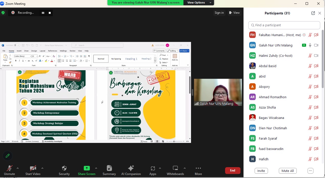HUMANIORA – (16/8/2024) Fakultas Humaniora UIN Maulana Malik Ibrahim Malang mengadakan kegiatan Evaluasi Pembelajaran, Kegiatan Kemahasiswaan, dan Fasilitas Fakultas pada Kamis, 15 Agustus 2024. Kegiatan yang digelar secara daring ini dihadiri oleh pimpinan Fakultas Humaniora serta mahasiswa perwakilan dari semester 3, 5, dan 7. Evaluasi ini merupakan bagian dari upaya fakultas untuk terus meningkatkan kualitas pendidikan, kesejahteraan mahasiswa, serta fasilitas yang tersedia, guna memastikan proses belajar mengajar berjalan dengan optimal.