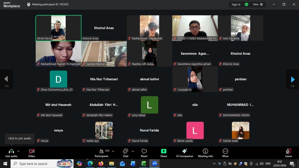 Kegiatan yang dilaksanakan secara daring melalui platform Zoom pada Kamis (22/1/2026) ini dihadiri langsung oleh Ketua Program Studi BSA, Dr. Abdul Basid, S.S., M.Pd., Sekretaris Program Studi, Dr. Moh. Zawawi, M.Pd., serta staf Prodi, Khoirul Anas, S.S.