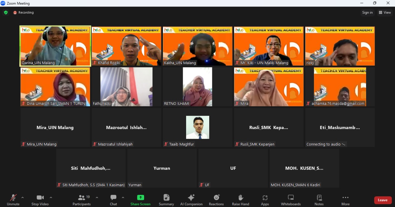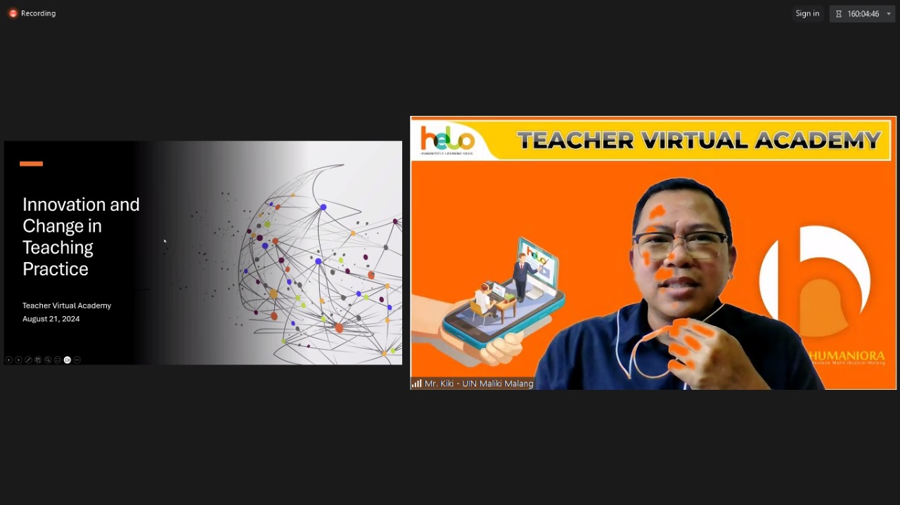 HUMANIORA – (21/8/2024) Program Teacher Virtual Academy (TVA) kembali melanjutkan sesi pelatihannya dengan memasuki pertemuan ke-4 pada 31 Juli 2024, mengusung tema “Innovation and Change in Teaching Practice.” Sesi kali ini menghadirkan Dr. Muzakki Afifuddin, M.Pd., seorang pakar linguistik dan dosen Fakultas Humaniora UIN Maulana Malik Ibrahim Malang, sebagai pemateri utama. Program ini dirancang untuk memberikan pelatihan dan pengembangan kompetensi bagi para pengajar Bahasa Inggris dari tingkat dasar hingga menengah di seluruh Indonesia.