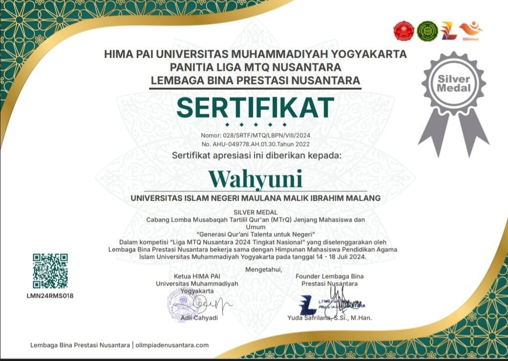HUMANIORA – (22/8/2024) Mahasiswa Program Studi Bahasa dan Sastra Arab Fakultas Humaniora UIN Maulana Malik Ibrahim Malang, Wahyuni, berhasil menorehkan prestasi gemilang dengan meraih medali perak dalam ajang Liga MTQ Nusantara. Kompetisi bergengsi ini diselenggarakan oleh Olimpiade Nusantara bekerja sama dengan Hima PAI Universitas Muhammadiyah Yogyakarta (UMY) dan berlangsung dari tanggal 9 hingga 17 Juli 2024.