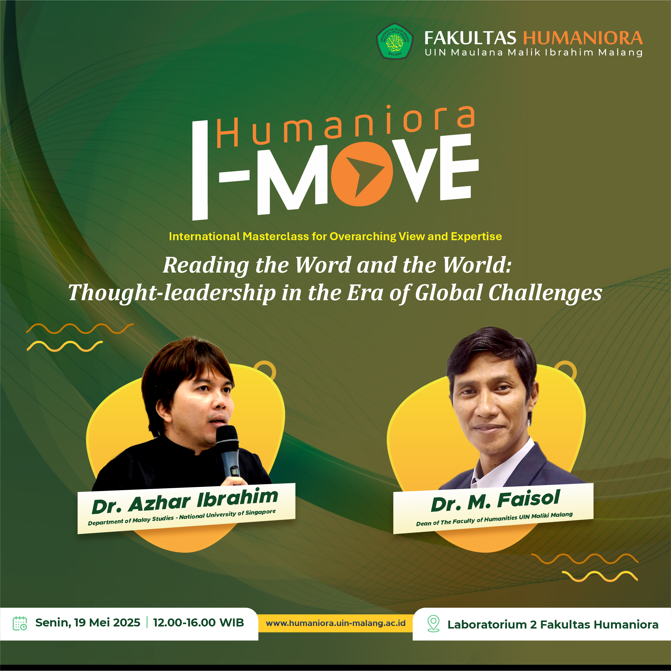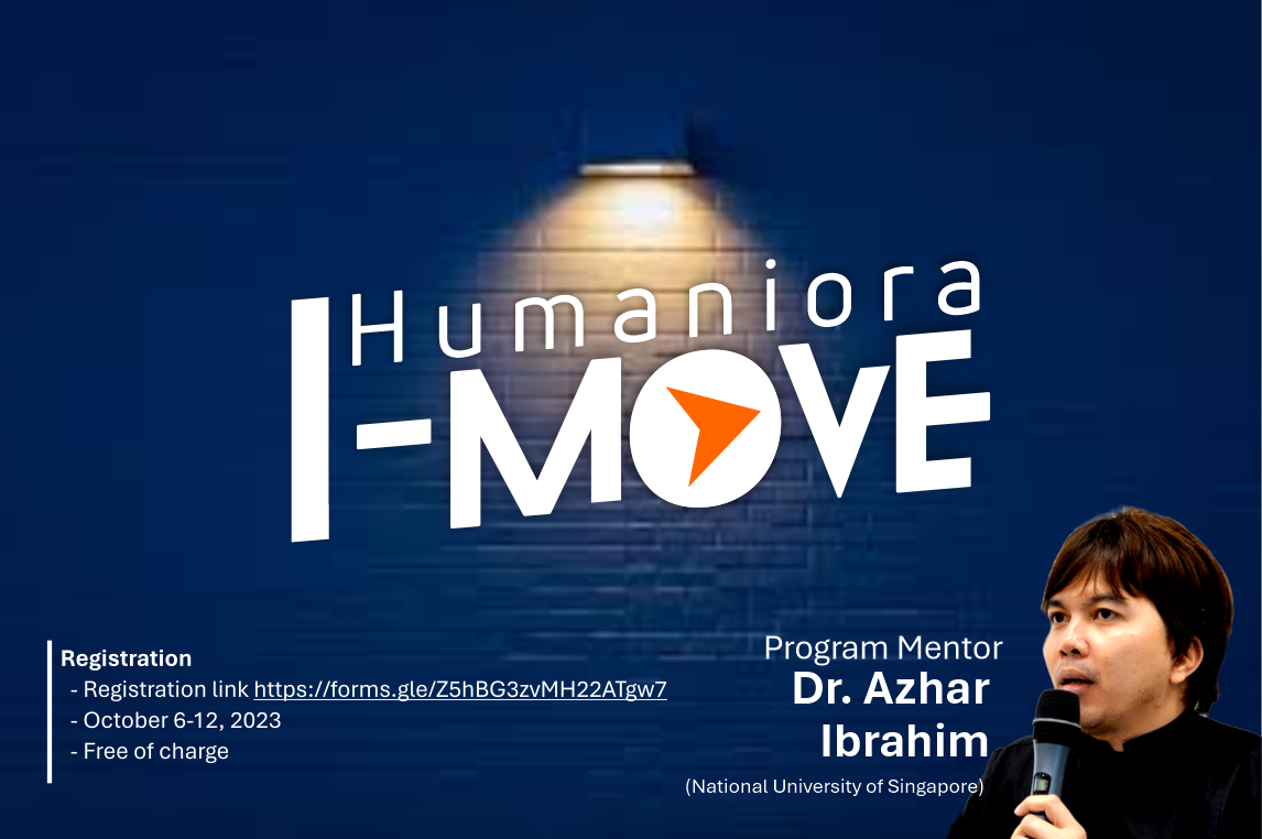 Humaniora International Masterclass for Overarching View and Expertise (I-MOVE) merupakan program strategis Fakultas Humaniora untuk membekali mahasiswa agar mampu beradaptasi dan bersaing di tengah dinamika global. I-MOVE dirancang sebagai ruang pengayaan akademik melalui pembelajaran intensif, diskusi, dan riset kolaboratif lintas disiplin dengan tema sastra, budaya, gender, pemikiran intelektual, hingga peluang beasiswa internasional. Salah satu daya tarik utama adalah kehadiran mentor internasional, Prof. Dr. Azhar Ibrahim dari National University of Singapore (NUS), yang memberikan bimbingan langsung sekaligus memperluas perspektif peserta. Selain kuliah dan seminar, program ini menghadirkan lokakarya penelitian untuk melatih kemampuan kritis, metodologis, dan reflektif mahasiswa. I-MOVE menjadi wujud nyata komitmen Fakultas Humaniora mencetak lulusan unggul, berwawasan global, dan siap berkontribusi di kancah internasional.